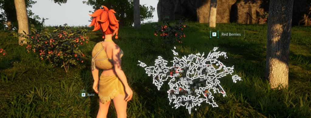 Işıldayan kolona git ve “fast travel” kilidini aç. Bu, haritada farklı yerlere ışınlanmamızı sağlıyor. Sağ üstte görevler göreceksin. Önce bir “primitive workbench” inşa et diyor bize ama acele etme. Yerlerden biraz odun biraz da taş toplayıp şelaleyi bulana kadar ilerle. Merak etme, sana saldıran bir şey olmayacak, güvendesin. Yolda yeterli taş, odun ve bulursan küçük mavi taşları (paldium) topla. Bu sırada bulduğun “red berry”leri de toplamayı unutma, durduk yere karnın acıkmaya başlayacak ve bu meyveler bizim temel besinimiz olacak.